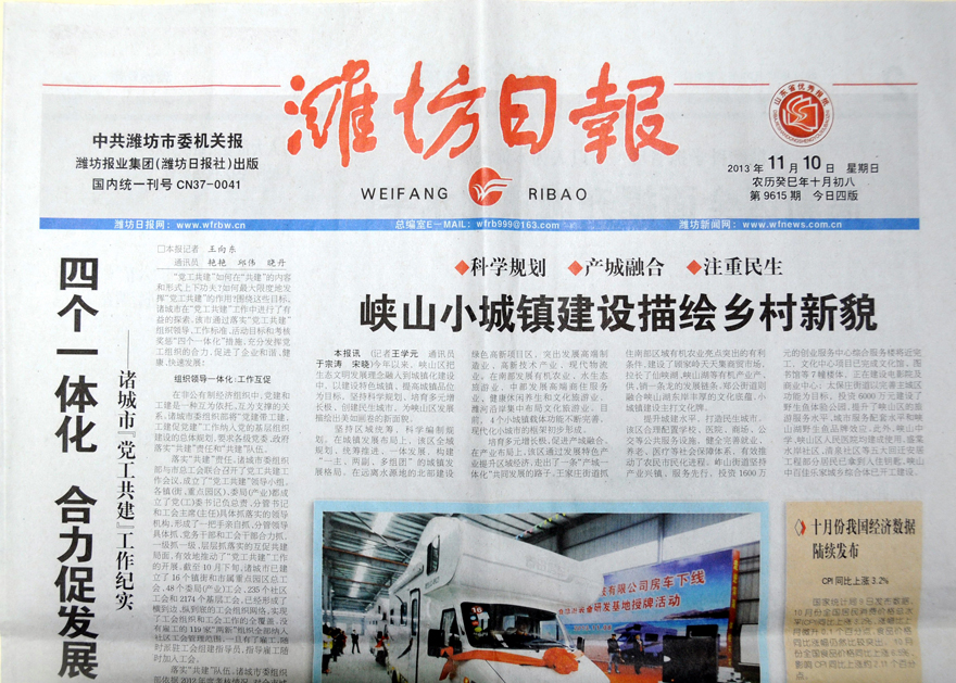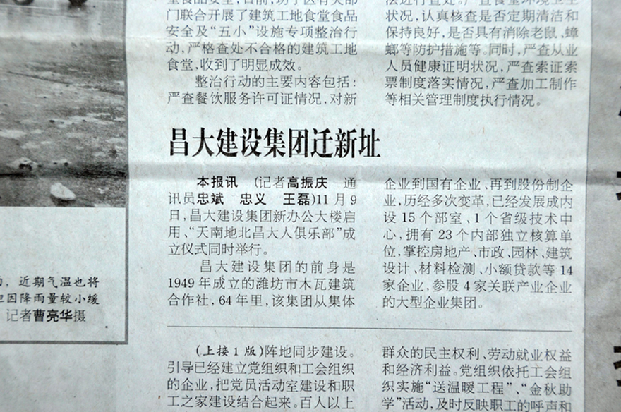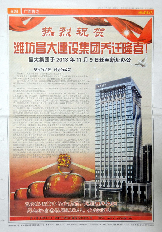 2013年11月09日,集團(tuán)喬遷至高新區(qū)健康東街6999號,濰坊日報、濰坊晚報刊登集團(tuán)喬遷慶典的報道。