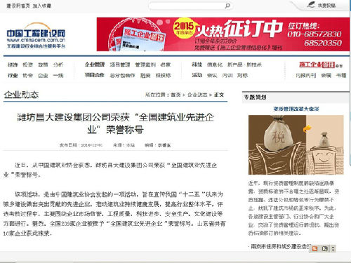 濰坊昌大建設(shè)集團(tuán)榮獲“全國建筑業(yè)先進(jìn)企業(yè)”榮譽(yù)稱號——中國工程建設(shè)網(wǎng)“企業(yè)動態(tài)”2