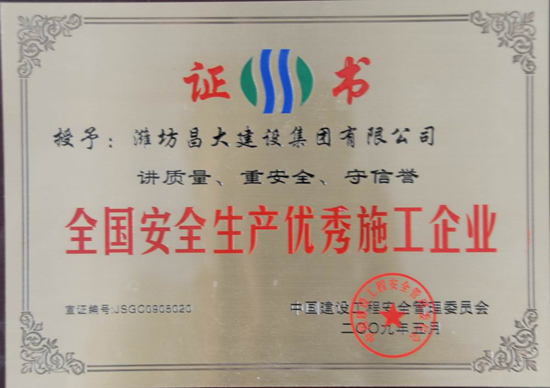 濰坊昌大建設(shè)集團(tuán)榮獲“全國安全生產(chǎn)優(yōu)秀施工企業(yè)”等三個(gè)全國性獎項(xiàng)