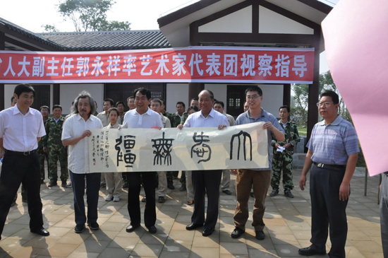 6月3日上午,四川省人大副主任郭永祥率藝術(shù)家代表團(tuán)赴北川新縣城慰問援建士。藝術(shù)家們或現(xiàn)場(chǎng)作畫,或引亢高歌,或與援川員工同臺(tái)表演,真誠表達(dá)他們對(duì)山東人民援川的感激之情。集團(tuán)公司援川員工還為藝術(shù)家代表團(tuán)合唱《援川之歌》。慰問演出前,郭永祥副主任還視察了集團(tuán)公司援建的安居房工程,藝術(shù)家們還實(shí)地參觀了新的安居房家居,看到漂亮、舒適的安居房,聽著援川人的感人事跡,藝術(shù)家們表達(dá)了對(duì)援川將士的由衷贊嘆,并再一次代表北川縣的受災(zāi)同胞對(duì)山東的援建表示真誠的謝意。 ![]() 圖為藝術(shù)家展示藝術(shù)作品