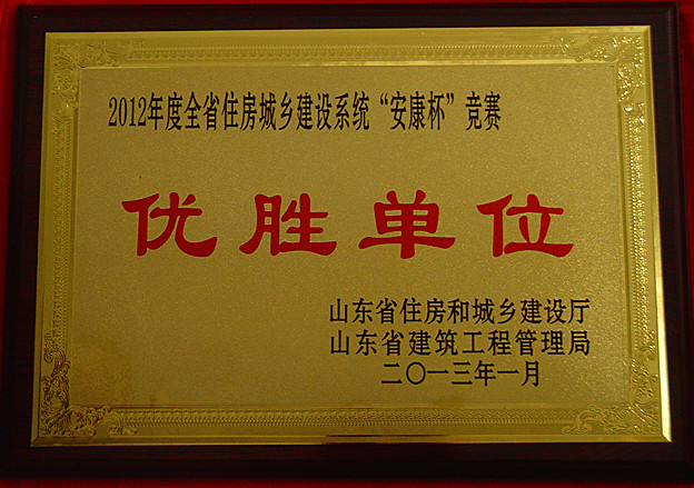 近日,山東省住房和城鄉(xiāng)建設(shè)廳、山東省建筑工程管理局發(fā)布2012年度山東省建設(shè)系統(tǒng)“安康杯”競賽活動評選結(jié)果,集團公司榮獲2012年度全省住房城鄉(xiāng)建設(shè)系統(tǒng)“安康杯”競賽優(yōu)勝單位稱號。