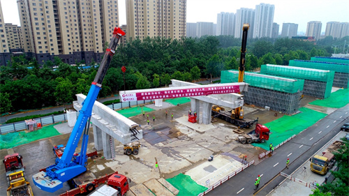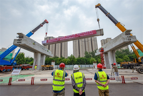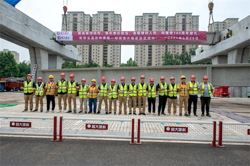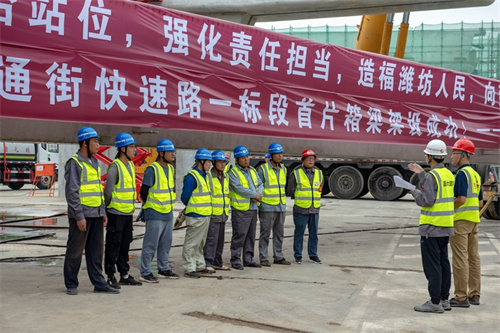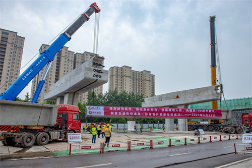 熱烈祝賀集團寶通街快速路工程第一片預(yù)制箱梁順利吊裝完成