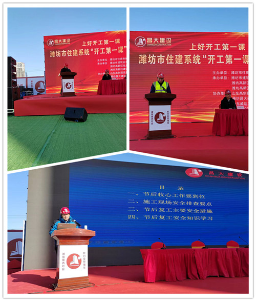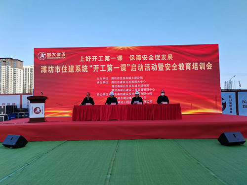 2023年2月15日上午,濰坊市住建系統(tǒng)“開(kāi)工第一課”啟動(dòng)活動(dòng)暨安全教育培訓(xùn)會(huì)議在集團(tuán)八建公司高創(chuàng)·水緣灣項(xiàng)目現(xiàn)場(chǎng)舉行。濰坊市住建局黨組書(shū)記、局長(zhǎng)鐘光文,濰坊市建筑業(yè)發(fā)展服務(wù)中心主任許增賢,高新區(qū)住建局局長(zhǎng)牟軍生等出席活動(dòng)。集團(tuán)公司總裁朱九洲,副總裁楊成國(guó)出席并全程參與活動(dòng)。各縣市區(qū)住建局主要負(fù)責(zé)人、分管負(fù)責(zé)人,相關(guān)業(yè)務(wù)科室負(fù)責(zé)人;房地產(chǎn)開(kāi)發(fā)企業(yè)、建筑施工企業(yè)、 監(jiān)理企業(yè)分管安全負(fù)責(zé)人,集團(tuán)安全生產(chǎn)部、各基層公司安全總監(jiān)、安全生產(chǎn)部全體人員共約200余人參會(huì)。