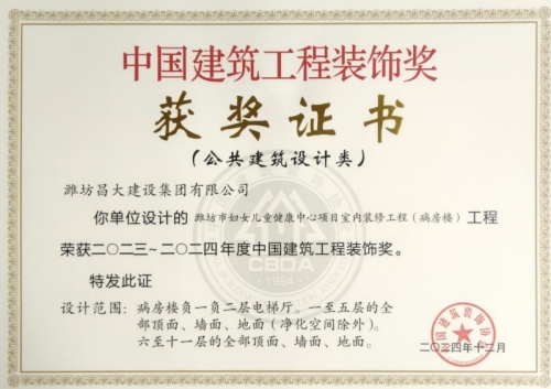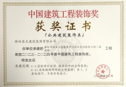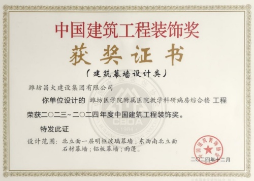 2024年12月10日,中國(guó)建筑裝飾協(xié)會(huì)在北京召開大會(huì),表彰2023~2024年度“中國(guó)建筑工程裝飾獎(jiǎng)”工程。集團(tuán)裝飾幕墻工程公司、山東鳶港裝飾工程有限公司的三項(xiàng)工程榮獲五個(gè)獎(jiǎng)項(xiàng):濰坊醫(yī)學(xué)院附屬醫(yī)院教學(xué)科研病房綜合樓(建筑幕墻類和幕墻設(shè)計(jì)類)、濰坊市婦女兒童健康中心病房樓(公共建筑裝飾類和公共建筑裝飾設(shè)計(jì)類),柒星國(guó)際2#住宅樓(建筑幕墻類)。